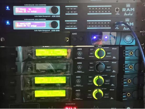 音响系统的核心是一台英国MIDAS M32LIVE数字台,这是一台40bit浮点信号处理,48k/44.1kHz的采样率,192kHz的数模/模数转换的数字台,最大可处理40路混音信号,有32个Midas PRO前置放大器输入通道,最新的M32LIVE还内置双SD / SDHC卡槽,可实时录制/播放32个双向通道,为现场混音工程师带来便利。无线话筒部分采用8个通道的AKG DMS800数字无线话筒,包括4台双通道DSR800接收机,4个DHT800/D7无线手持和4个DPT800腰包(配置领夹和头戴咪各4个),为了保证无线系统的稳定性,还配置了APS4天线分配和SRA2指向性天线。
