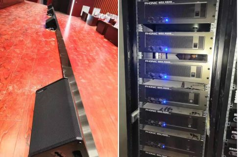 扬声器的选型在大型厅堂中是重中之重,在该厅堂中声桥的左中右扬声器选择了德国TWAUDiO的T20i点声源阵列扬声器,138dB最大输出声压级和小巧的外观非常适合声桥安装,下补声拉声像扬声器由2只M15多功能全频扬声器完成,左右超低音扬声器是18寸的B17i,为了补偿声桥扬声器不能覆盖前三排观众的不足,还设计了4个C5紧凑型的5寸同轴扬声器,隐藏安装在台唇。流动返送扬声器选择了M10多功能全频。该剧场还有播放教育影片的功能,因此还设计了环绕扬声器系统,采用了JBL AC299全频扬声器,90x90度的覆盖角度很好地满足了需求。驱动主扩声扬声器的功放选择了西班牙RAMAUDIO的S6044和T1204四通道功放,环绕声扬声器由PHONIC MAX3500驱动,系统还配置了2台四进八出的RAMAUDIO ADM2048数字音频处理器,做扬声器系统的处理。