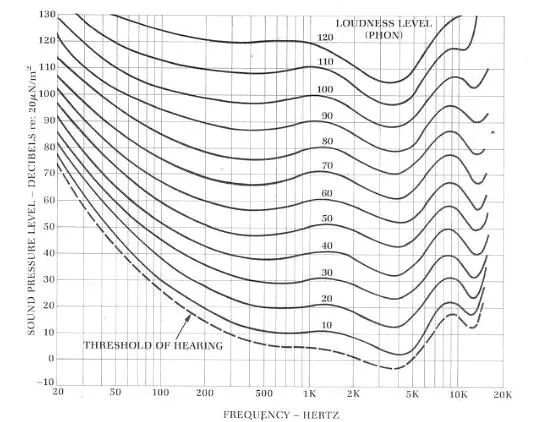 在进行声压级计算前,必须选择一个相应环境下合适的基准声压级,而基准声压级的选择必须了解正常人耳的等响曲线,即“Fletcher-Munson curves(弗莱彻芒森曲线)”。